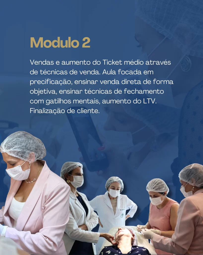 Precificação estratégica, venda direta objetiva, gatilhos mentais de fechamento, aumento do LTV, posicionamento do procedimento e fidelização de pacientes no consultório.